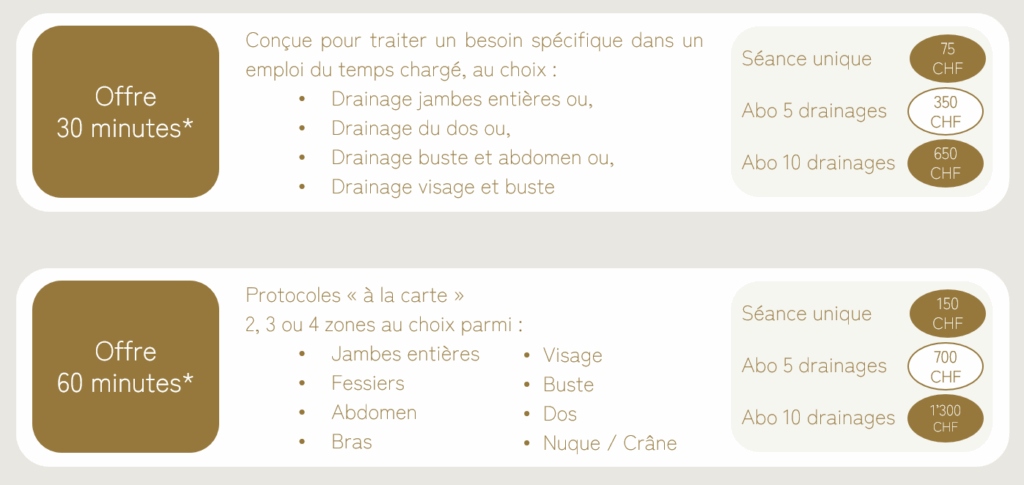 Le drainage lymphatique s’effectue à même la peau. Selon la ou les zones désirées, prévoyez des sous-vêtements confortables qui vous mettent à l’aise.
